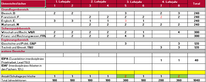 Die folgende Übersicht zeigt je nach Fach und Semester die Anzahl der Lektionen pro Woche sowie die Anzahl Schultage (Änderungen möglich).